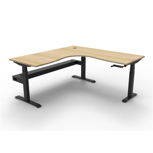 • Rapidline Boost manual crank height adjustable corner workstation with cable tray. Natural oak top with black frame.