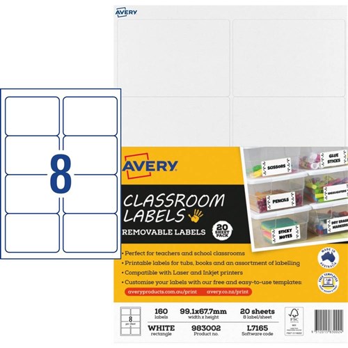 Avery Classroom Labels Laser Printer 99.1 x 67.7mm White 160 Labels 20 Sheets