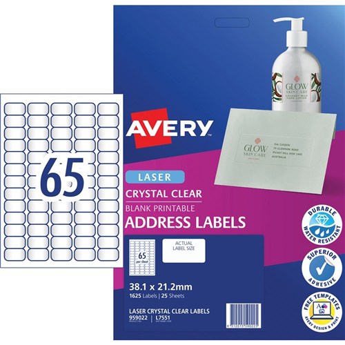 Avery Crystal Clear Laser Address Labels White L7551 38.1x21.2mm 65UP 1625 Labels