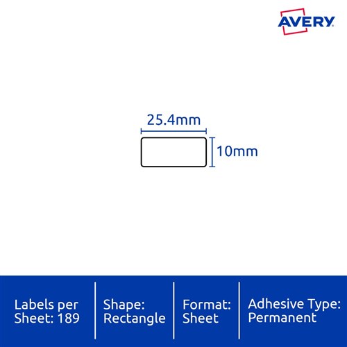 • Size: 25.4mmx10mm 3780 labels, 20 sheets. 189 labels per sheet (189UP).