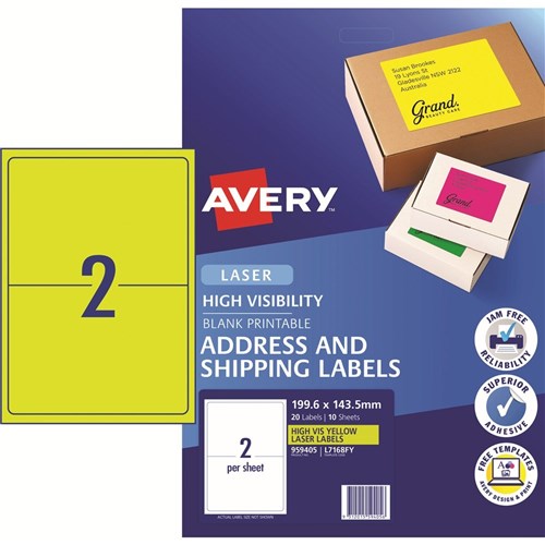 Avery High Visibility Shipping Laser Labels Yellow L7168FY 199.6x143.5mm 2UP 20 Labels