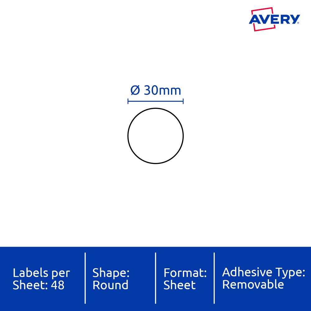 • Size: 30mm diameter 960 labels, 20 sheets. 48 labels per sheet (48UP).