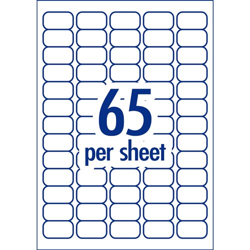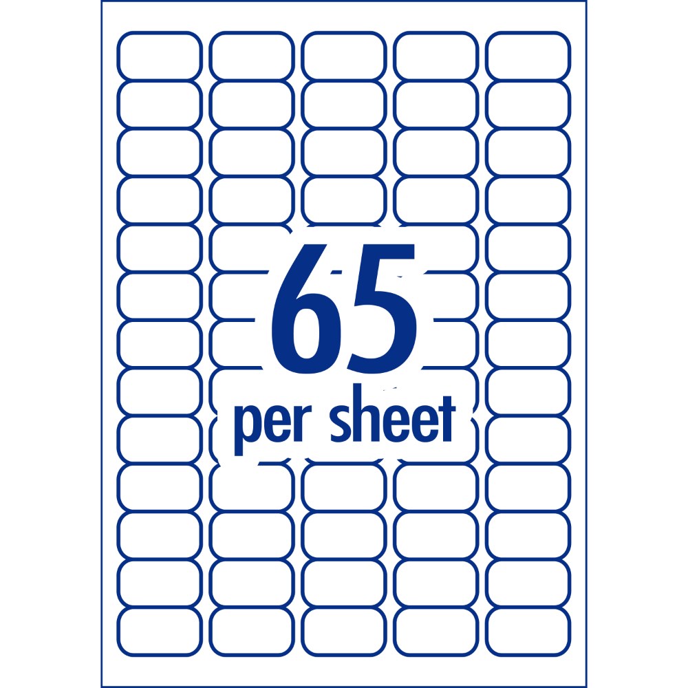 • Size: 38.1 x 21.2mm, 1300 labels, 20 sheets, 65 labels per sheet (65UP).