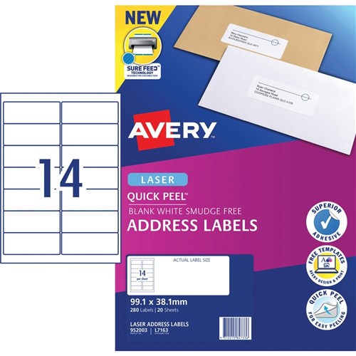 Avery Quick Peel Address Laser Labels White L7163 99.1x38.1mm 14 UP 280 Labels 20 Sheets