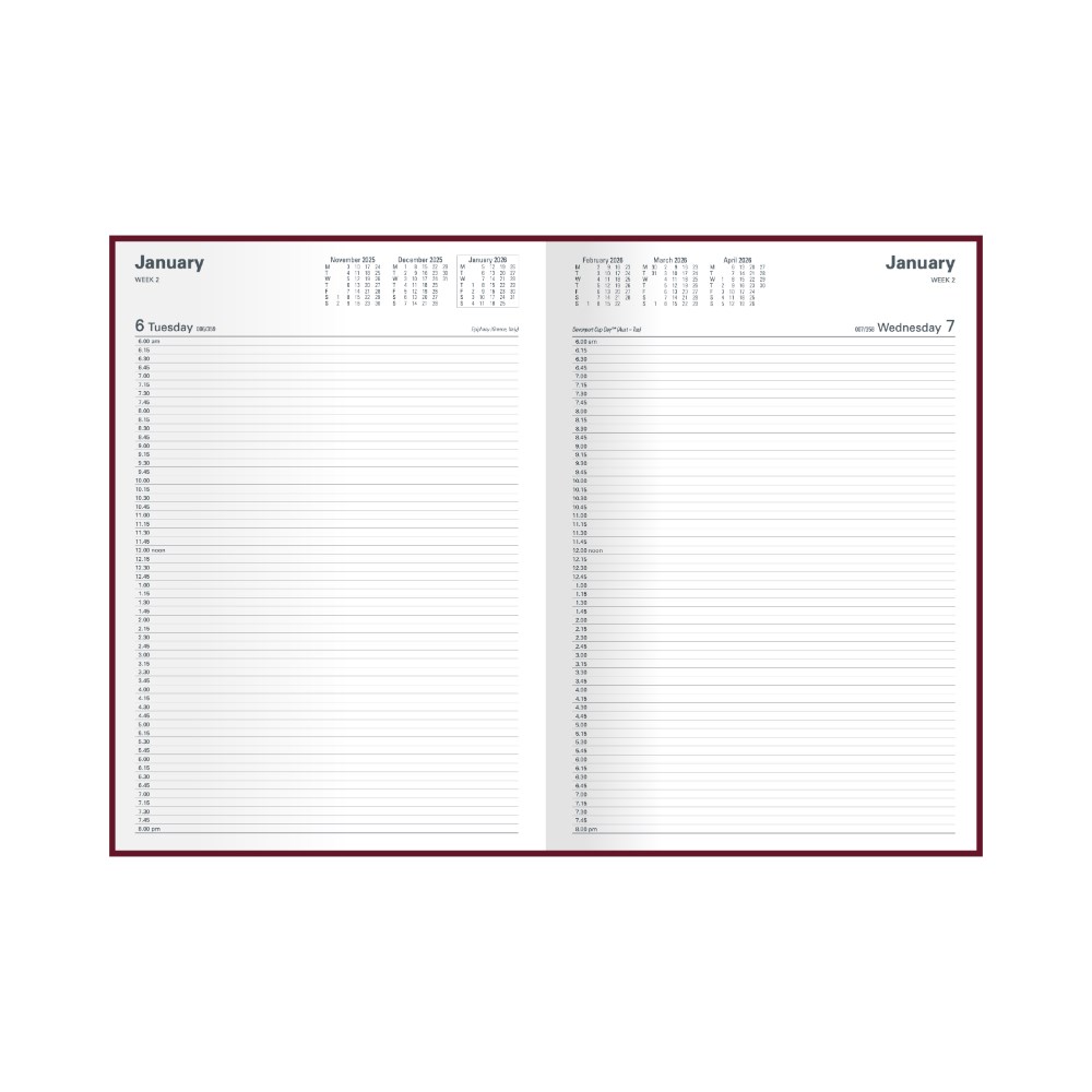 • Page layout include six month calendars, week counts, Julian day and times printed clearly down each page.
