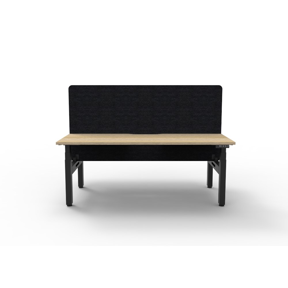 • Natural Oak worksurface with rigid edging and 50mm scallop cable cut out. E0 rated 25mm top. Black Satin powder coat underframe. Eco screen.