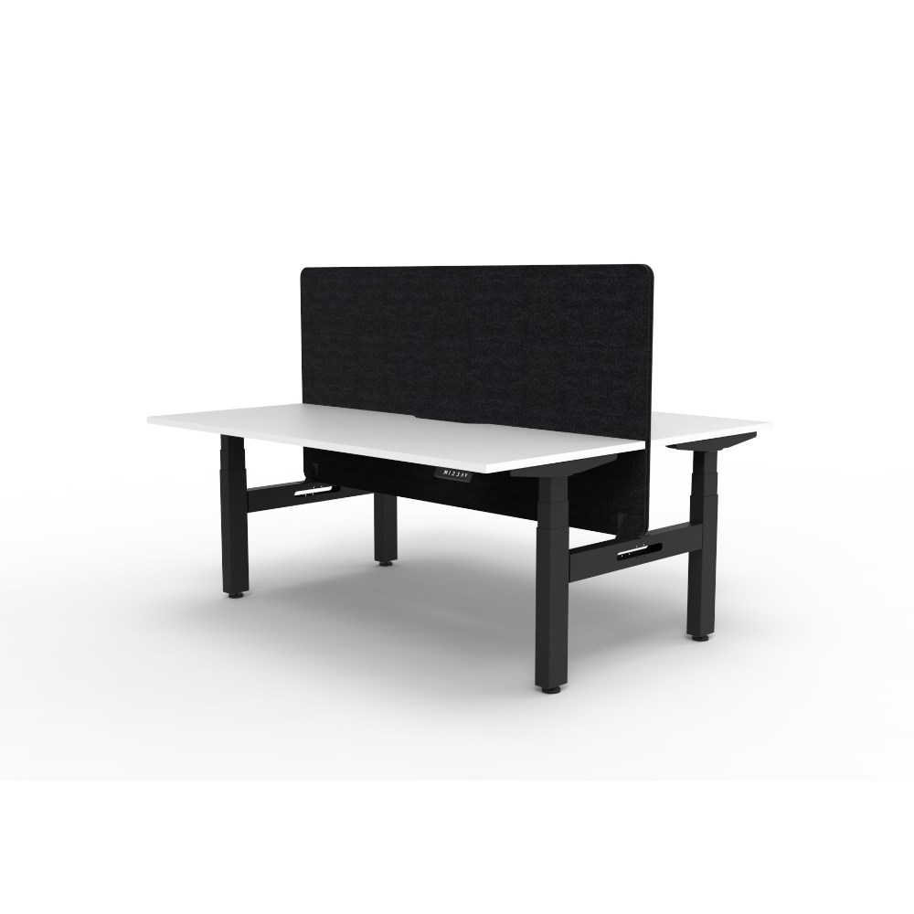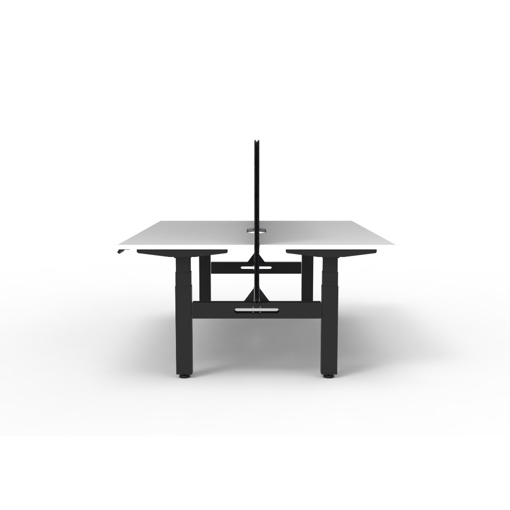 • Natural White worksurface with rigid edging and 50mm scallop cable cut out. E0 rated 25mm top. Black Satin powder coat underframe. Eco screen.