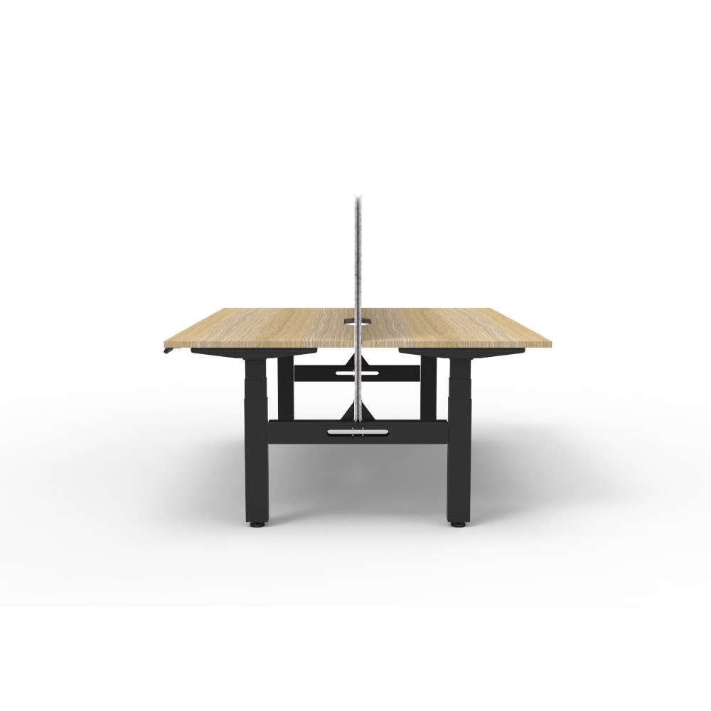 • Natural Oak worksurface with rigid edging and 50mm scallop cable cut out. E0 rated 25mm top. Black Satin powder coat underframe. Eco screen.