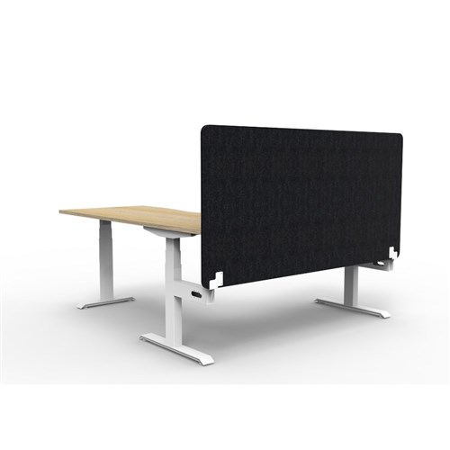 • Manual crank height adjustable corner workstation with Natural Oak top and White Satin frame, Black Eco screen.