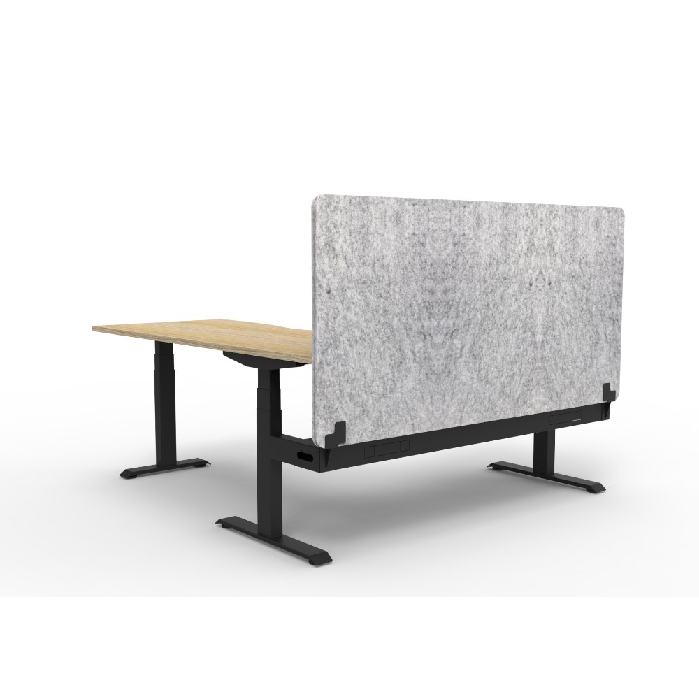 • Manual crank height adjustable corner workstation with Natural Oak top and Black Satin frame, Grey Eco screen and cable tray.
