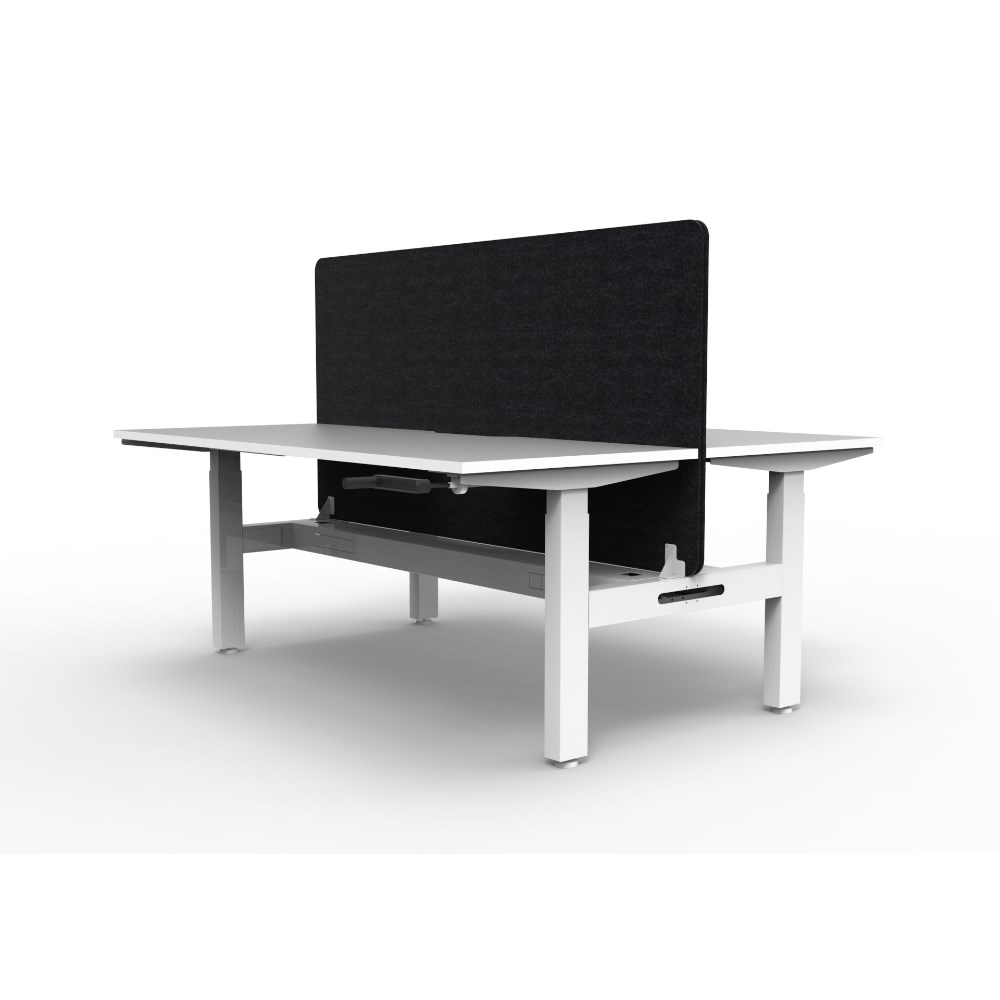 • Manual crank height adjustable 2 person back to back workstation with Natural White top and White Satin frame, Black Eco screen and cable tray.
