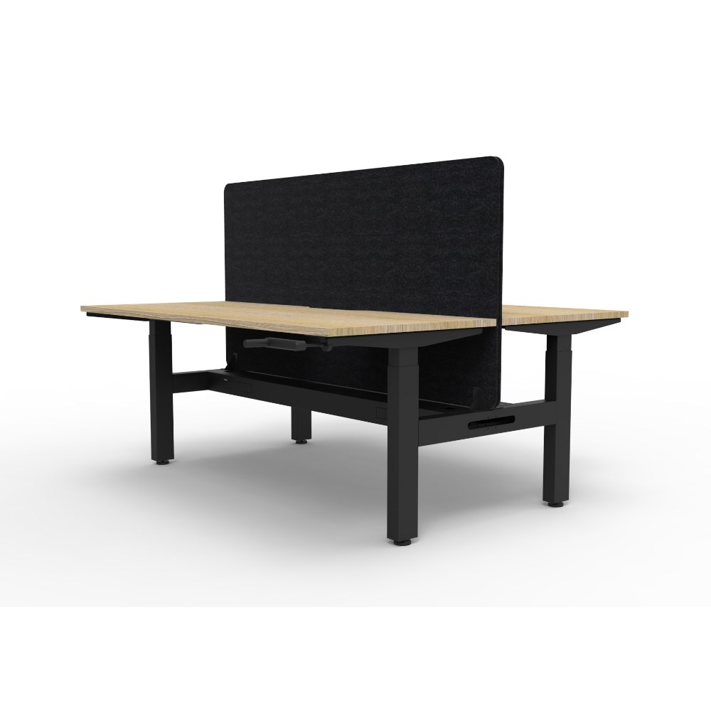 • Manual crank height adjustable 2 person back to back workstation with Natural Oak top and Black Satin frame, Black Eco screen and cable tray.