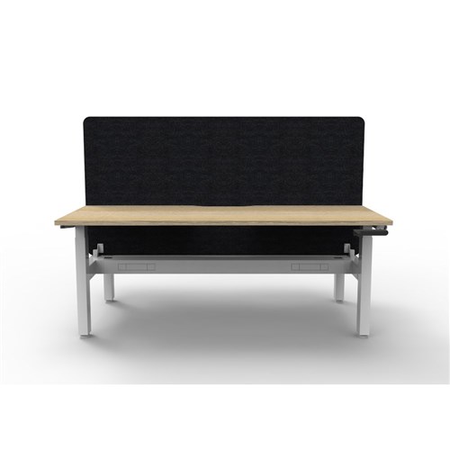 • Manual crank height adjustable 2 person back to back workstation with Natural Oak top and White Satin frame, Black Eco screen and cable tray.