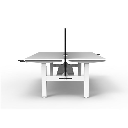 • Manual crank height adjustable 2 person back to back workstation with Natural White top and White Satin frame, Black Eco screen and cable tray.