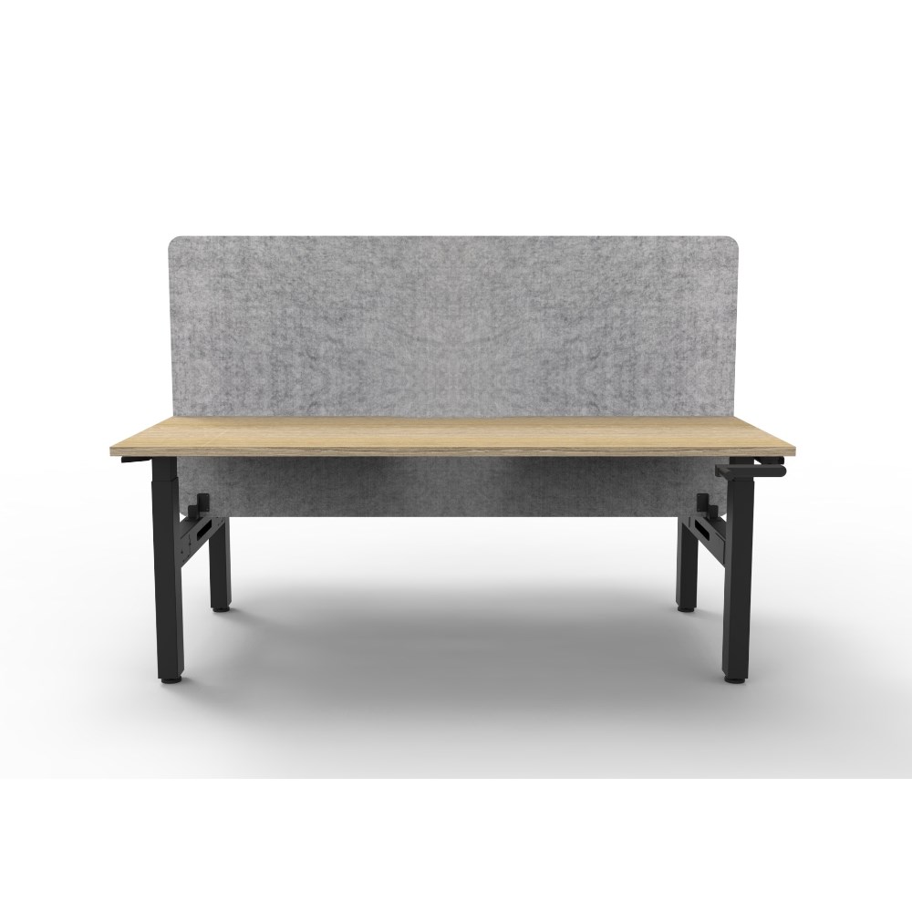 • Manual crank height adjustable single sided workstation with Natural Oak top and Black Satin frame, Grey Eco screen.