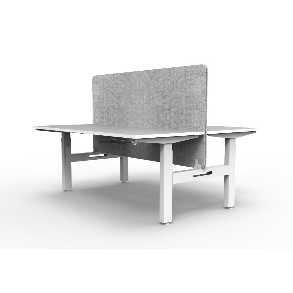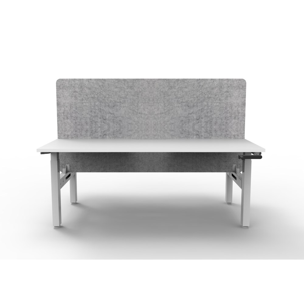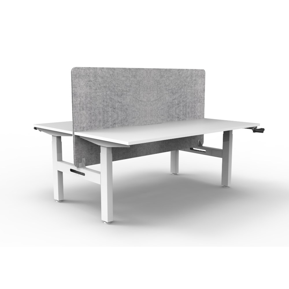 • Manual crank height adjustable 2 person back to back workstation with Natural White top and White Satin frame, Grey Eco screen.