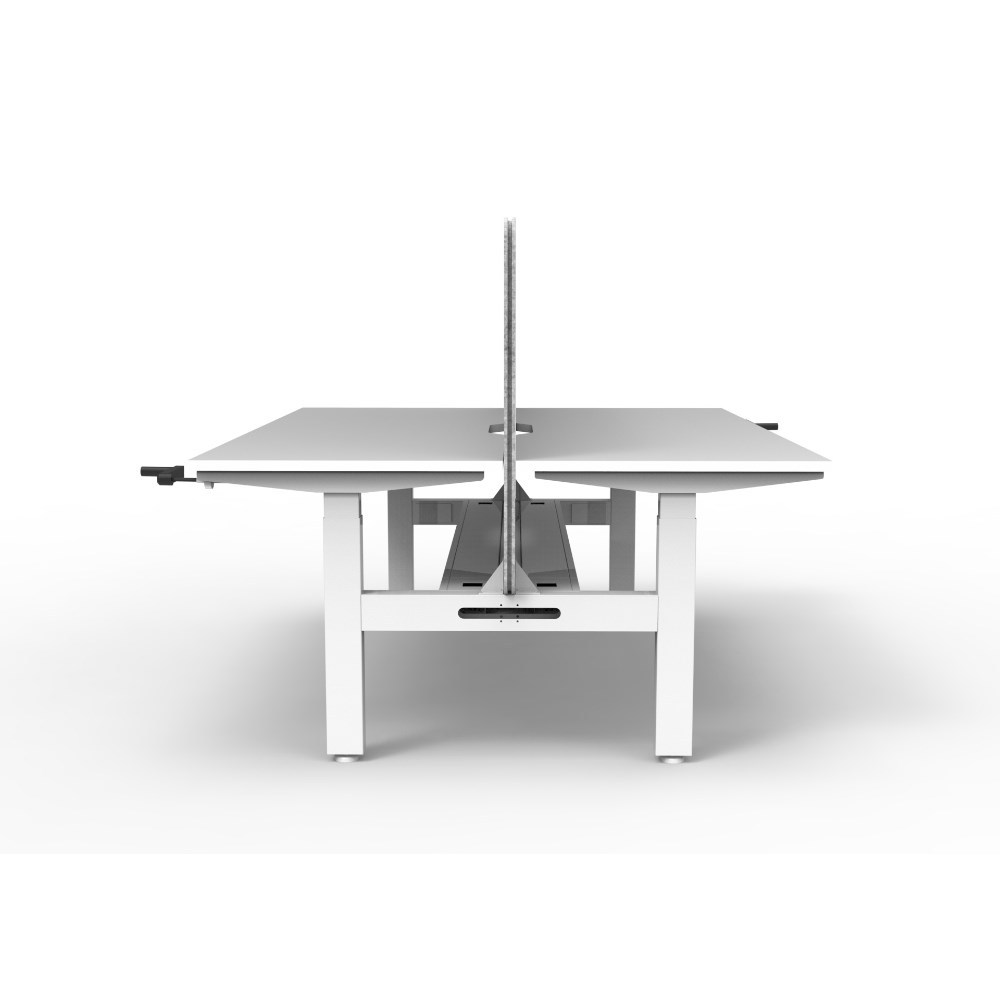 • Manual crank height adjustable 2 person back to back workstation with Natural White top and White Satin frame, Grey Eco screen and cable tray.