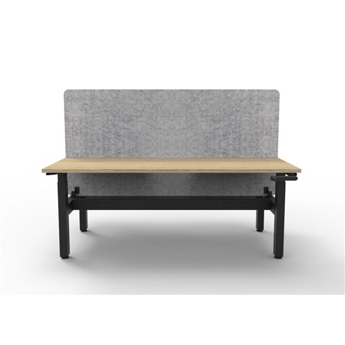 • Manual crank height adjustable 2 person back to back workstation with Natural Oak top and Black Satin frame, Grey Eco screen and cable tray.