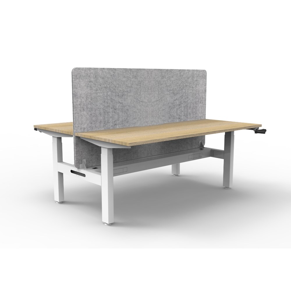 • Manual crank height adjustable 2 person back to back workstation with Natural Oak top and White Satin frame, Grey Eco screen and cable tray.