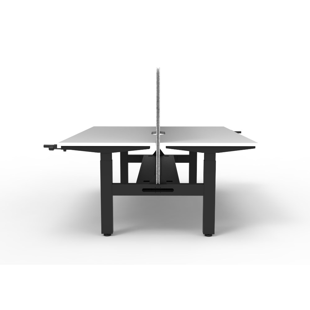• Manual crank height adjustable 2 person back to back workstation with Natural White top and Black Satin frame, Grey Eco screen and cable tray.