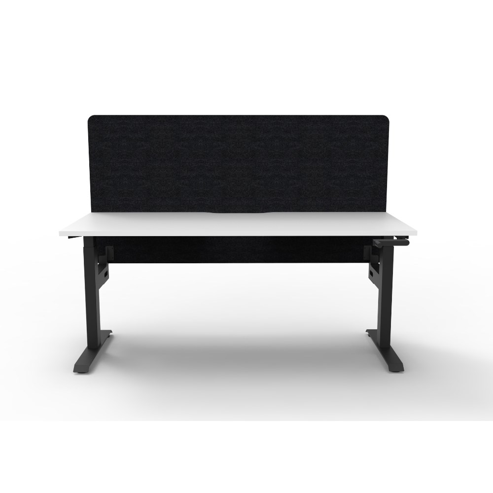 • Manual crank height adjustable single sided workstation with Natural White top and Black Satin frame, Black Eco screen.