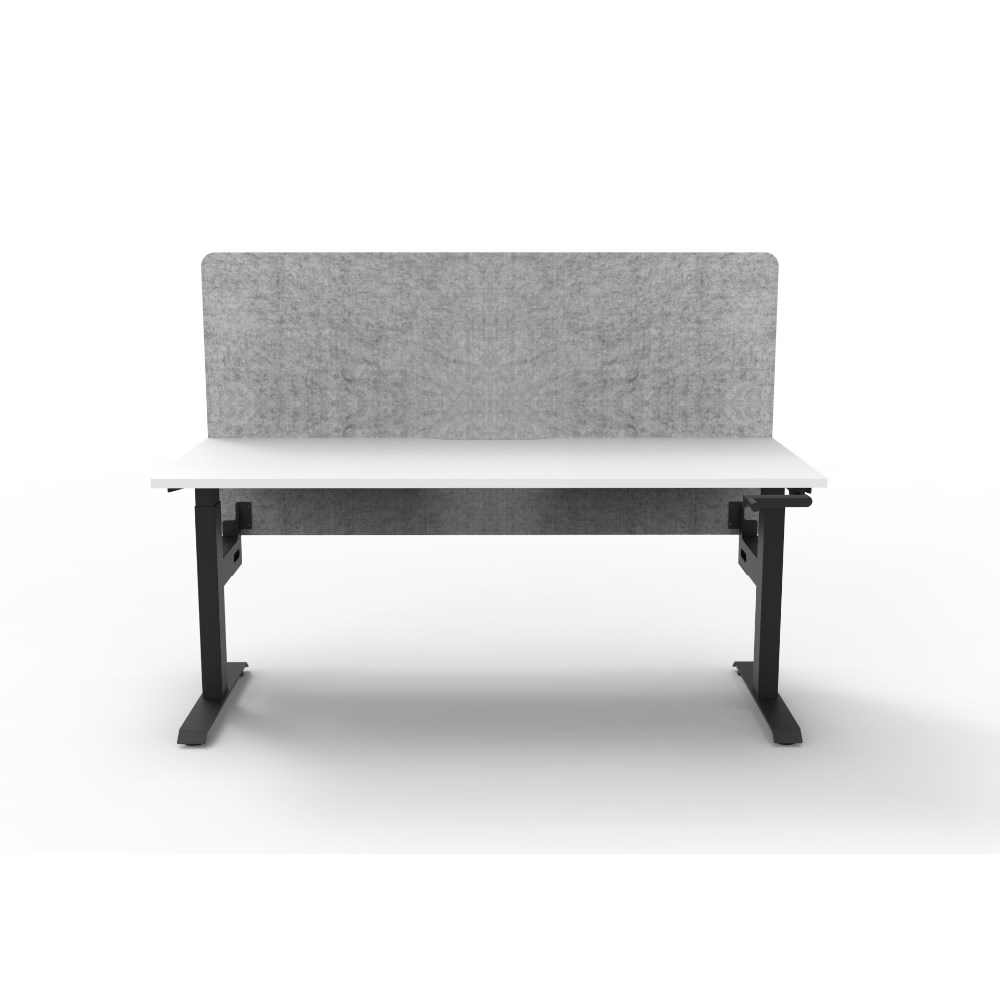 • Manual crank height adjustable single sided workstation with Natural White top and Black Satin frame, Grey Eco screen.