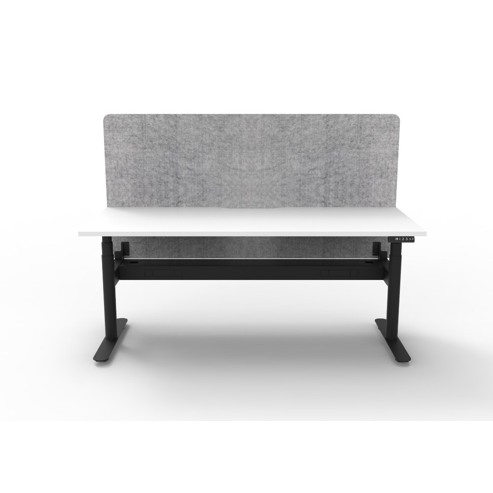 • Natural White worksurface with rigid edging and 50mm scallop cable cut out. E0 rated 25mm top. Black Satin powder coat round-leg frame. Eco screen and cable tray.