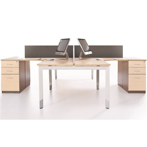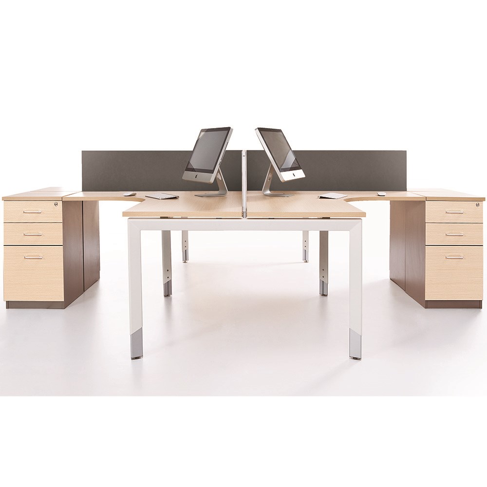 • 4 Person Corner Workstation Snow Maple top and White frame. Includes 4 x 2 drawer 1 file fixed pedestals.
